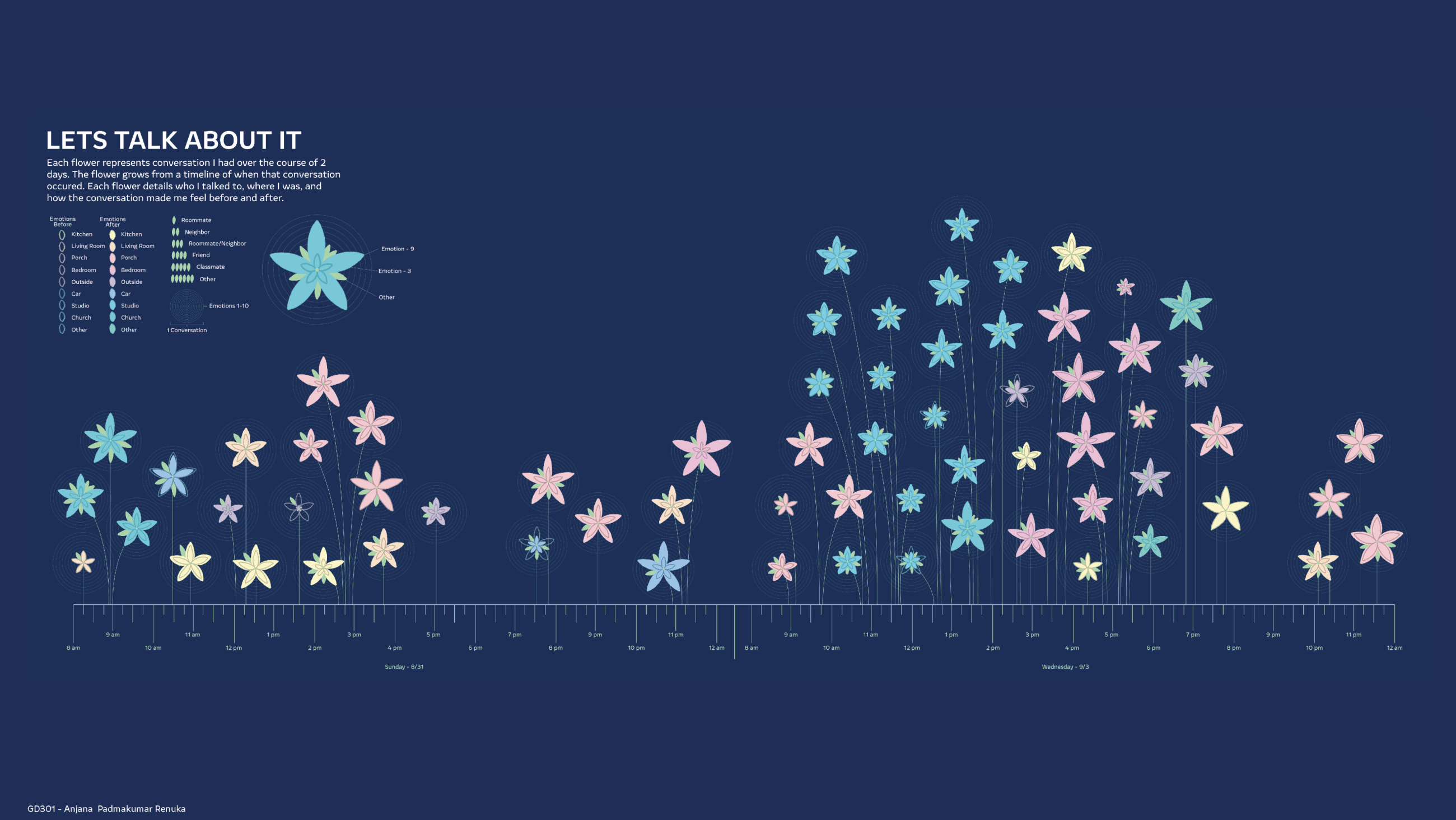 Students collect and visualise data points from their daily life to create visualisations centered on humanistic design principles.